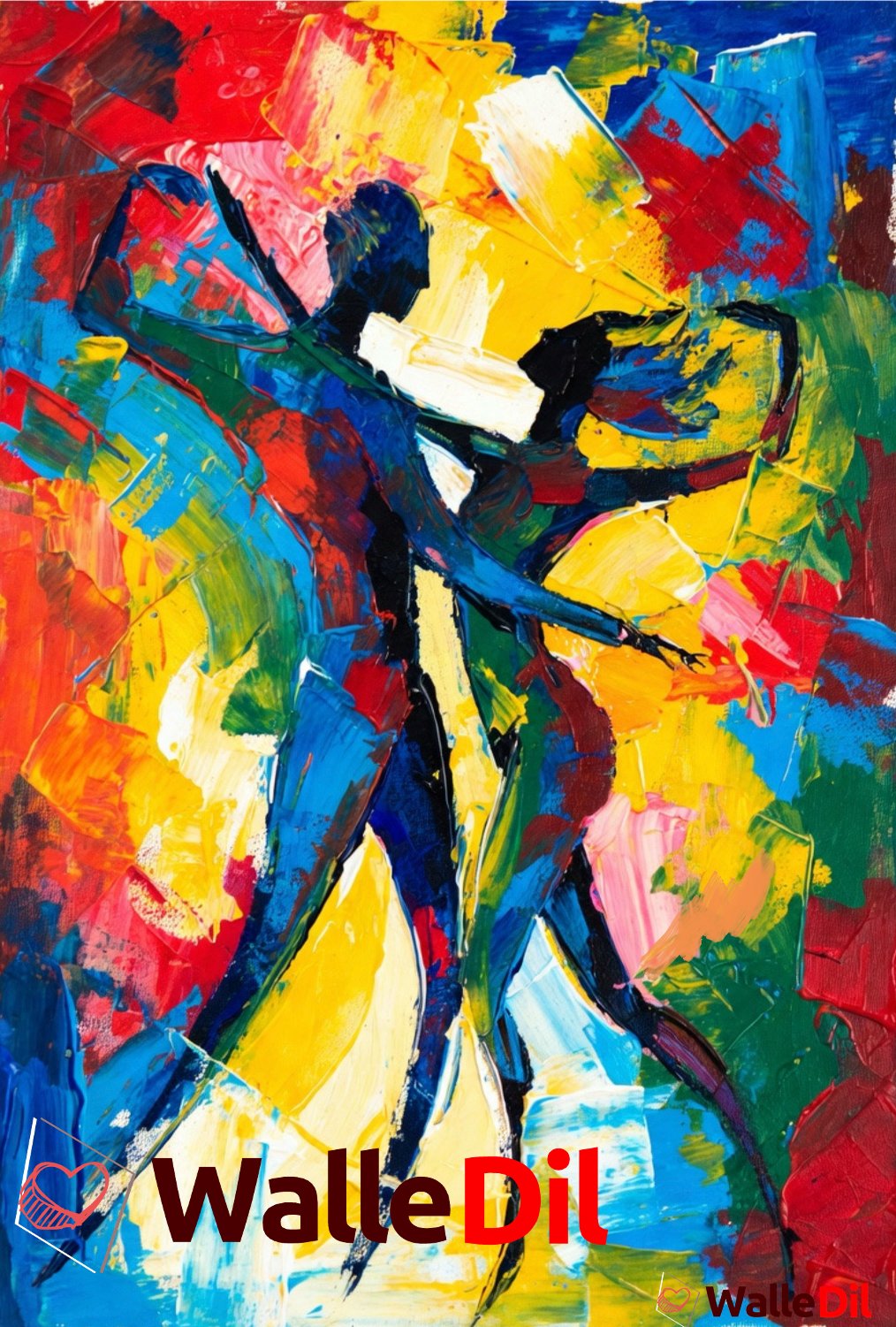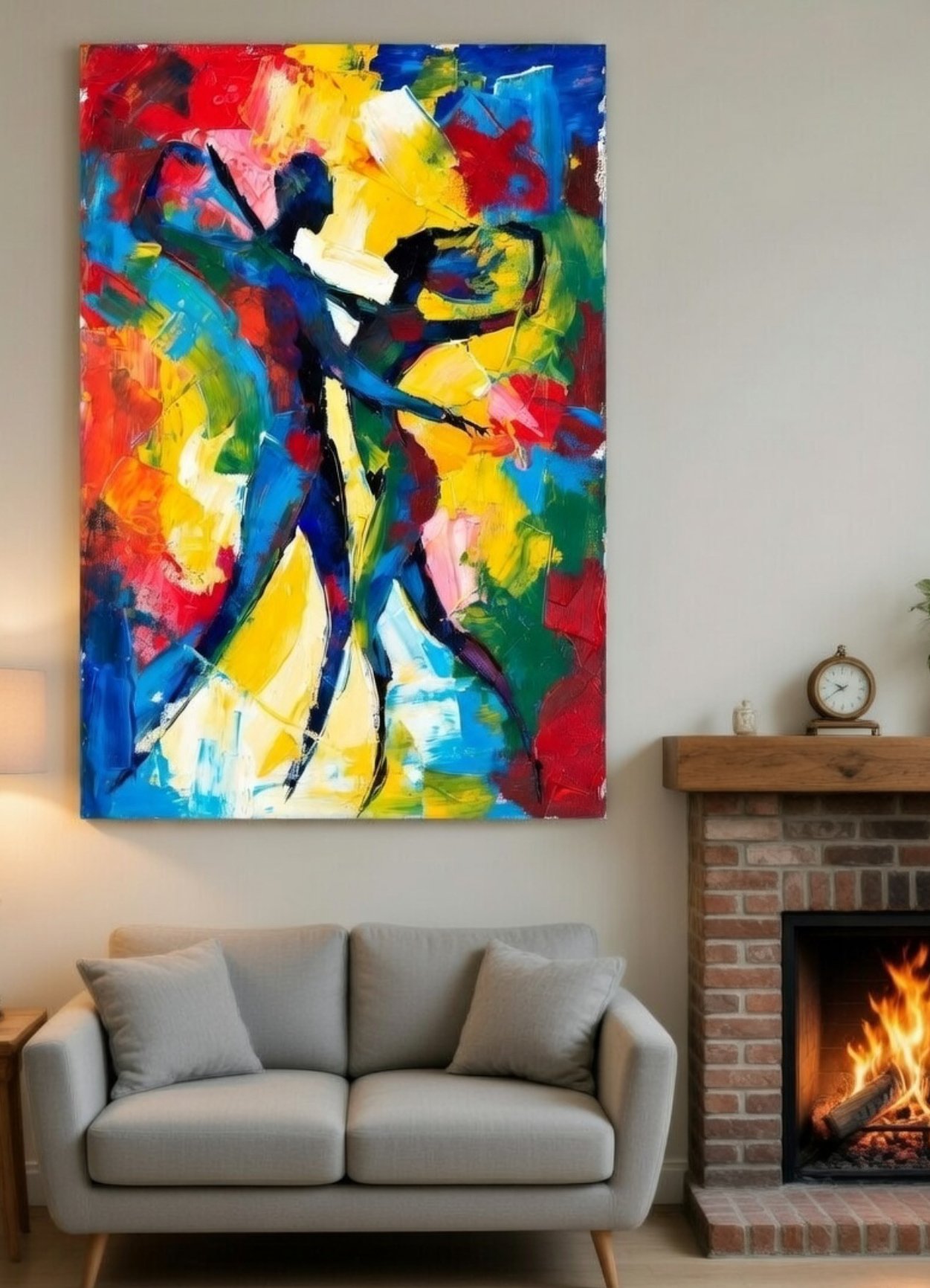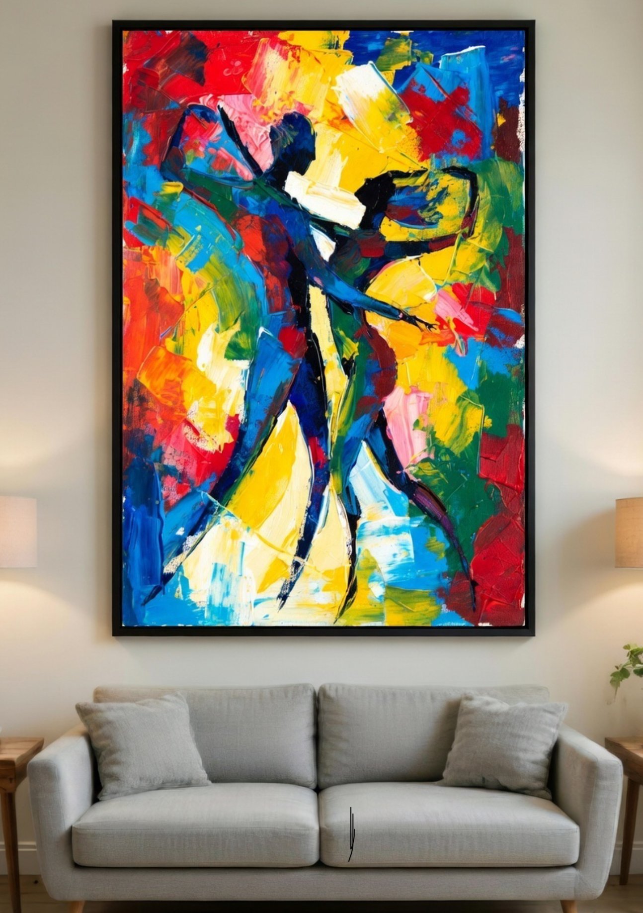 Portrait, abstract depiction of couple dancing, in stretched frame. Ready to hang.